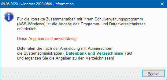 Ab Version 2020.0614 werden Sie beim ersten Programmstart anlässlich einer Neuinstallation nach alten Partnerprogrammen gefragt (s.l.u.). Wenn Sie hier ASS-Windows angeben, wird der entsprechende Eintrag in …\cmh\winprosa\winprosa.ini automatisch gesetzt und Sie erhalten die Meldung, dass noch Angaben fehlen (s.r.u.), die Sie im Programm eintragen können. Sie müssen also keine Ordner mehr aufsuchen.