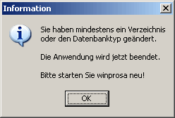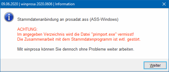 Natürlich ist ab jetzt der Zugriff auf die alte Datenbank prosadat.prwverwehrt und die neue Datenbank prosadat.ass fehlt noch, was winprosa Ihnen anzeigt.