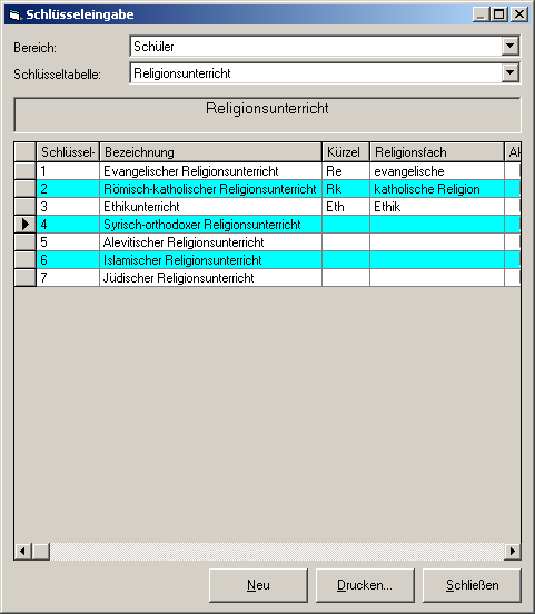 Rufen Sie den Dienst Vorgabefelder > Schlüsseltabellen auf. Wählen Sie dort den Bereich Schüler und die Schlüsseltabelle Religionsunterricht auf und ergänzen Sie die Eintragungen in den Spalten Kürzel und Religionsfach (s.r.).