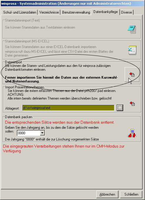 Rufen Sie die Karteikarte Datenbankpflege in der Systemadministration auf und klicken Sie dort auf den Knopf bei Datenimport (s.r.).