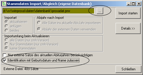 Im Importfenster (s.l.) wird oben die Importdatei angezeigt. Hier müssen Sie mittels nebenstehendem Knopf die Datei prosadat.prw im winprosa-Datenbank-Verzeichnis angeben. Unten müssen Sie durch Anhaken die Identifikation mit Geburtsdatum und Namen zulassen.