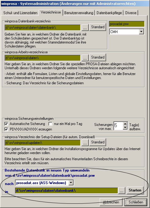 Tragen Sie unten bei Bestehende Datenbank in neuen Typ umwandeln den Typ prosadat.ass (ASS-Windows) ein und geben Sie darunter das winprosa-Datenbankverzeichnis an.