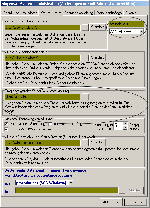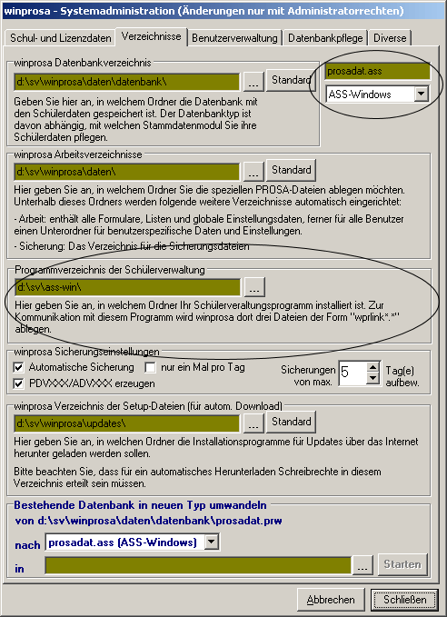 Starten Sie winprosa als Administrator und rufen Sie im Dienst Datei > Datenbank > Systemadministration die Karteikarte Verzeichnisse auf.