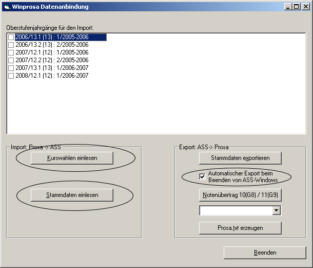 Voraussetzung ist, dass ASS-Windows 2006 und winprosa ab Version 1.96b unabhängig voneinander laufen. In winprosa ist dann eine (von ASS völlig unabhängige) "Kopie" der NGO-Schüler-Stammdaten vorhanden (in der Datei prosadat.prw im winprosa-Datenbankverzeichnis von Hand erfasst oder über die dortige Textschnittstelle eingelesen). Diese "Kopie" wird von winprosa laufend um die Kurswahl- und Leistungsdaten erweitert.