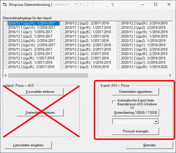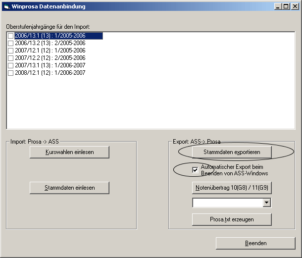 - (R) Falls die NGO-Schüler in ASS vorhanden sind (Regelfall), muss prosadat.ass von ASS erzeugt werden und anschließend von winprosa um die Kurswahl- und Leistungsdaten ergänzt werden.