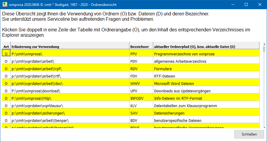 Im Dienst Datei > winprosa-Ordnerstruktur (s.r.) werden die von winprosa belegten Ordner samt Namenskürzel aufgelistet; dort können Sie also u.a. die Bedeutung der Einträge in den INI-Dateien nachvollziehen.