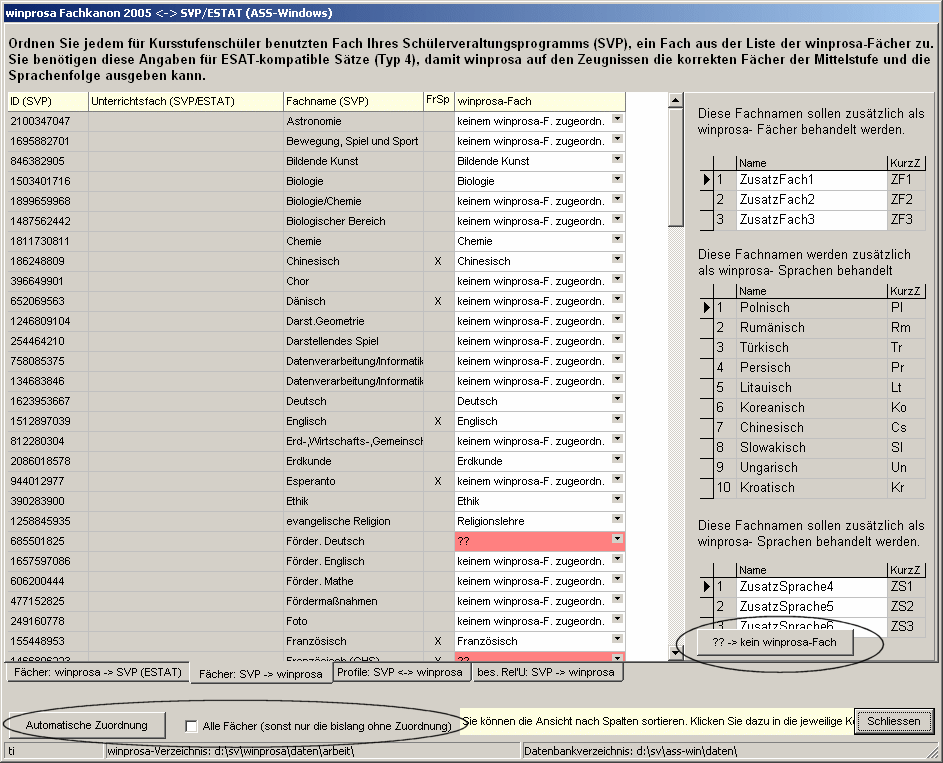 > Die erste Karteikarte Fächer: winprosa -> SVP(ESTAT) benötigen Sie erst später, nachdem Sie auf ASS-Windows 2006 geupdatet haben.