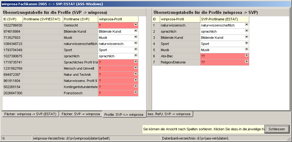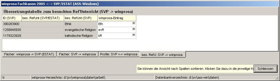 Bearbeiten Sie anschließend die Profile auf der Karteikarte Profile: SVP <->winprosa und den besuchten Religionsunterricht auf der Karteikarte bes. Rel'U: SVP->winprosa (siehe die folgenden beiden Bilder). Beim 'besuchten Religionsunterricht' können nur diejenigen Fächer bearbeitet werden, die auf der Karteikarte Fächer: SVP -> winprosa eingetragen worden waren.