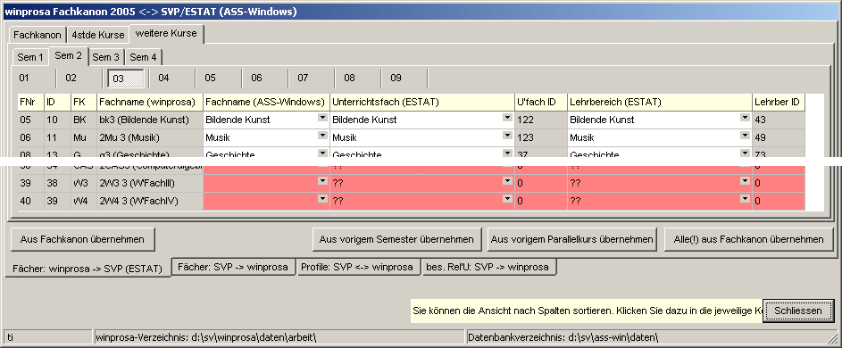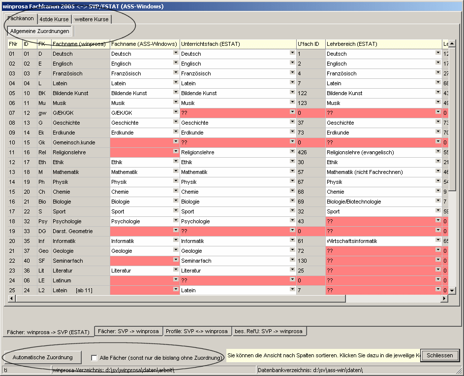 Im Bild oben müssen noch einige Fächer überarbeitet werden: z.B. das winprosa-Fach Gemeinsch.kunde wird wegen der unterschiedlichen Schreibweise nicht als ASS-Windows-Fach Gemeinschaftskunde erkannt, also muss letzteres aus der zugehörigen Dropdown-Liste herausgesucht werden.