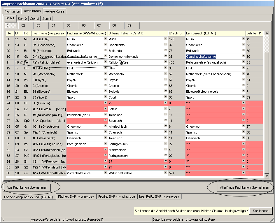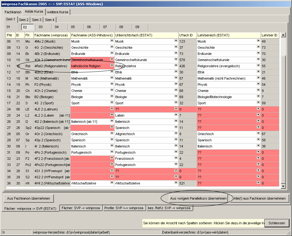Oben werden gerade die vierstündigen ersten Parallelkurse des ersten Semesters bearbeitet. Nach Klick auf den Knopf Aus Fachkanon übernehmen müssen nur Sonderfälle wie z.B. Religion angepasst werden: Der winprosa-Religionskurs 1 scheint im Beispiel ein evangelischer zu sein.