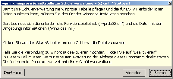 Das Programm winprosa-Schnittstelle zur Schülerverwaltung (wprlink.exe) aus dem Startmenü von ASS benötigen Sie nur im Notfall: normalerweise wird diese vom ASS-Datenanbindungsprogramm nur dann gestartet, wenn winprosa nicht automatisch zu finden ist (s.r.).