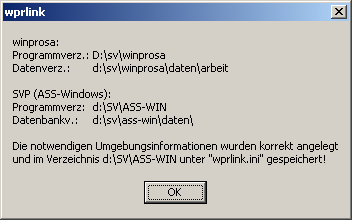 Dorthin kopiert winprosa nach dem Schließen des Administrationsfensters die drei Dateien wprlink.exe, wprlink.ini und wprlink32.dll. Erst dadurch weiß ASS, wie es mit winprosa kommunizieren kann.