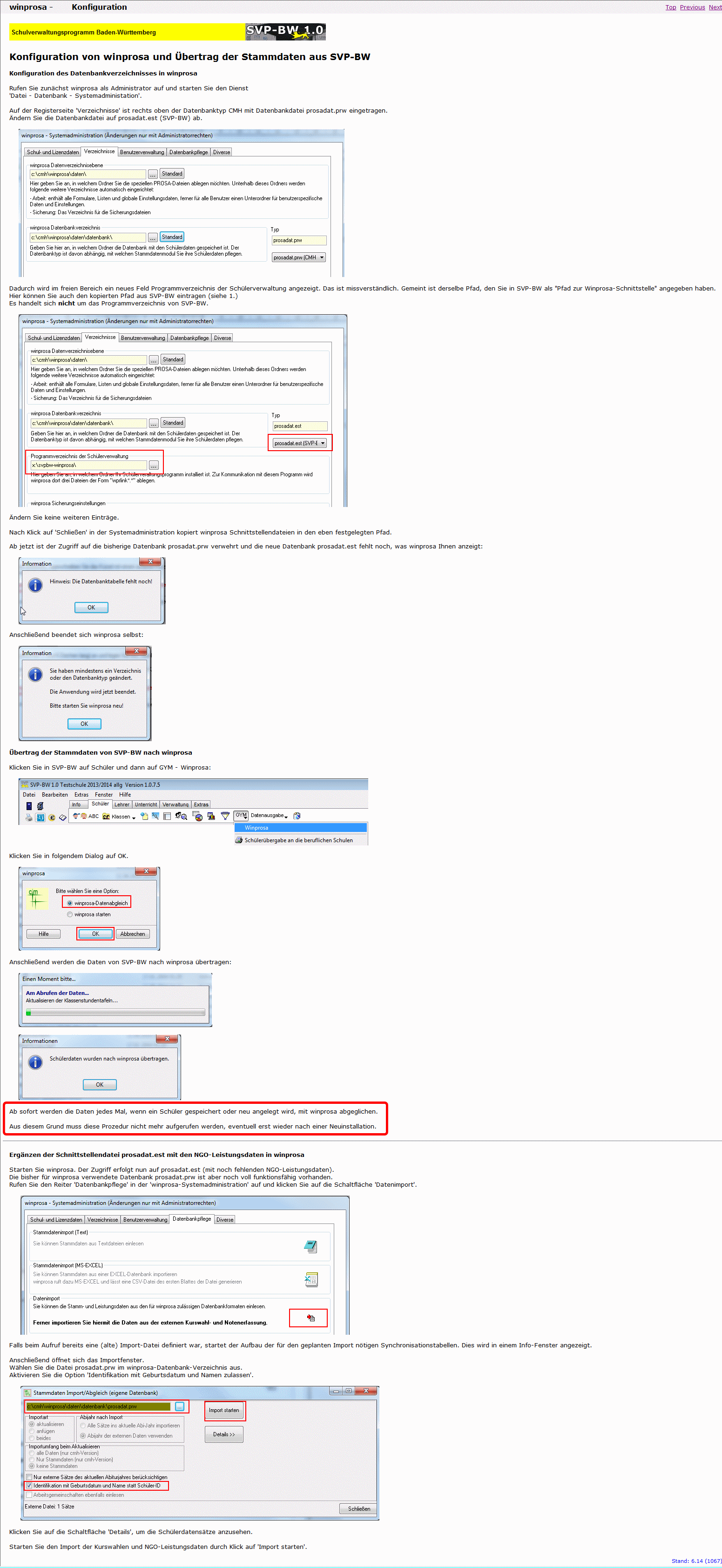 Im Laufe der Zeit kann das Wissen verloren gegangen sein, wie die Zusammenarbeit von SVP-BW und winprosa organisiert werden muss. Daher werden im nachfolgenden Text in aktualisierter Form die nach wie vor gültigen Grundsätze des Zusammenspiels winprosa ↔ SVP-BW (vormals MasterSchool/Estrella) beschrieben und am Ende des Textes Tipps zum Umzug auf ein neues System gegeben.