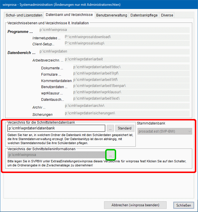 Dort wird in der unteren Hälfte des Fensters rechts der (neue) Stammdatenbanktyp prosadat.est (SVP-BW) angezeigt. - Tragen Sie links bei Verzeichnis für die Schnittstellendatenbank den Standard ein.*)