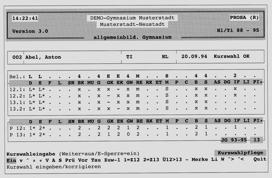 Kurswahlerfassung in PROSA am Beispiel des Jahrganges 93-95: in der Matrix sind nach rechts bis zu 40 Fächer möglich, nach unten die vier Halbjahre aufgeführt (die gleiche Matrix war grundsätzlich auch in MCS vorhanden). Unter der Matrix ist die Parallelkurseinteilung des Schülers dargestellt. Eine entsprechende Matrix dient der Notenverwaltung. Intern sind die einzelnen Spalten binär in Bytes kodiert.