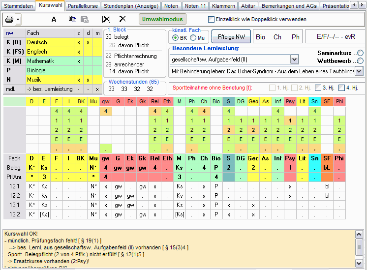 - Abrechnungspflicht Leistungskurse: zwei der Leistungsfächer zählen nach Schülerwahl doppelt im Kursblock (= 8 Kurse).
